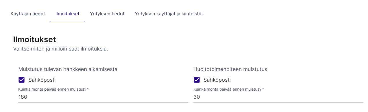 Voit tarkastaa vastuuhenkilön menemällä taloyhtiön perustietoihin etusivulta. Muistutus sähköpostin asetuksia voit hallinnoida omassa profiilissa kohdassa Ilmoitukset.
