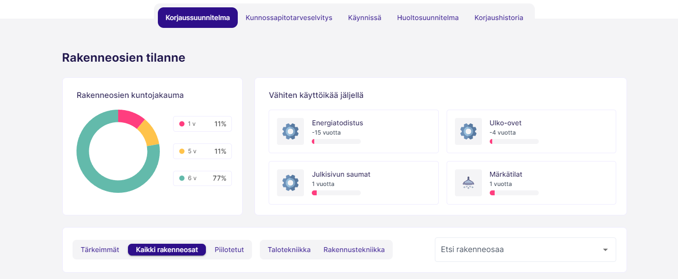 Korjaussuunnitelman tärkein tehtävä on ohjata ja opastaa oikea-aikaiseen kunnossapitoon. Tällä sivulla käyttäjä näkee helposti yhdellä silmäyksellä taloyhtiön teknisen yleistilanteen ja mihin tulisi keskittyä seuraavaksi. Korjaussuunnitelma rakentuu kahdesta osasta: Rakenneosat ja suositukset.
