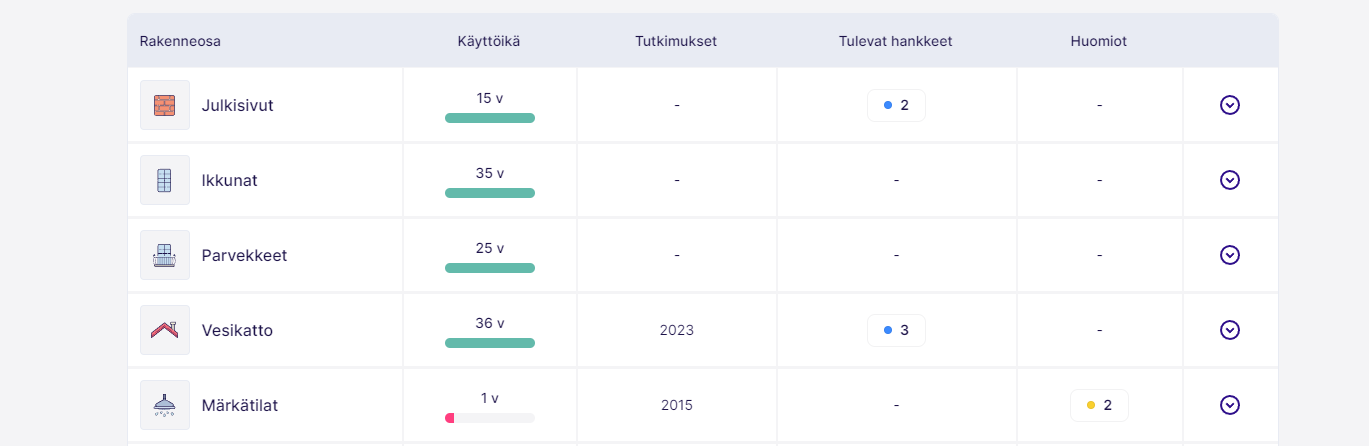 Muistiinpanoihin voit tallentaa rakenneosa kohtaista lisätietoa. Tulevat hankeet näyttää kaikki tulevaisuuteen tallennetut hankkeet mihin on valittu kyseinen rakenneosa. Näet erikseen rakenneosaan tehdyt tutkimukset ja kaikki tehdyt toimnepiteet. Voit tallentaa rakenneosaan valokuvia ja piirustuksia. Nämä tulevat automaattisesti tarjouspyyntömateriaaleihin kun tehdään kyseiseen rakenneosaan liityvää tarjouspyyntöä. Opasteet kohdasta löydät rakenneosaan liittyvää lisätietoa.