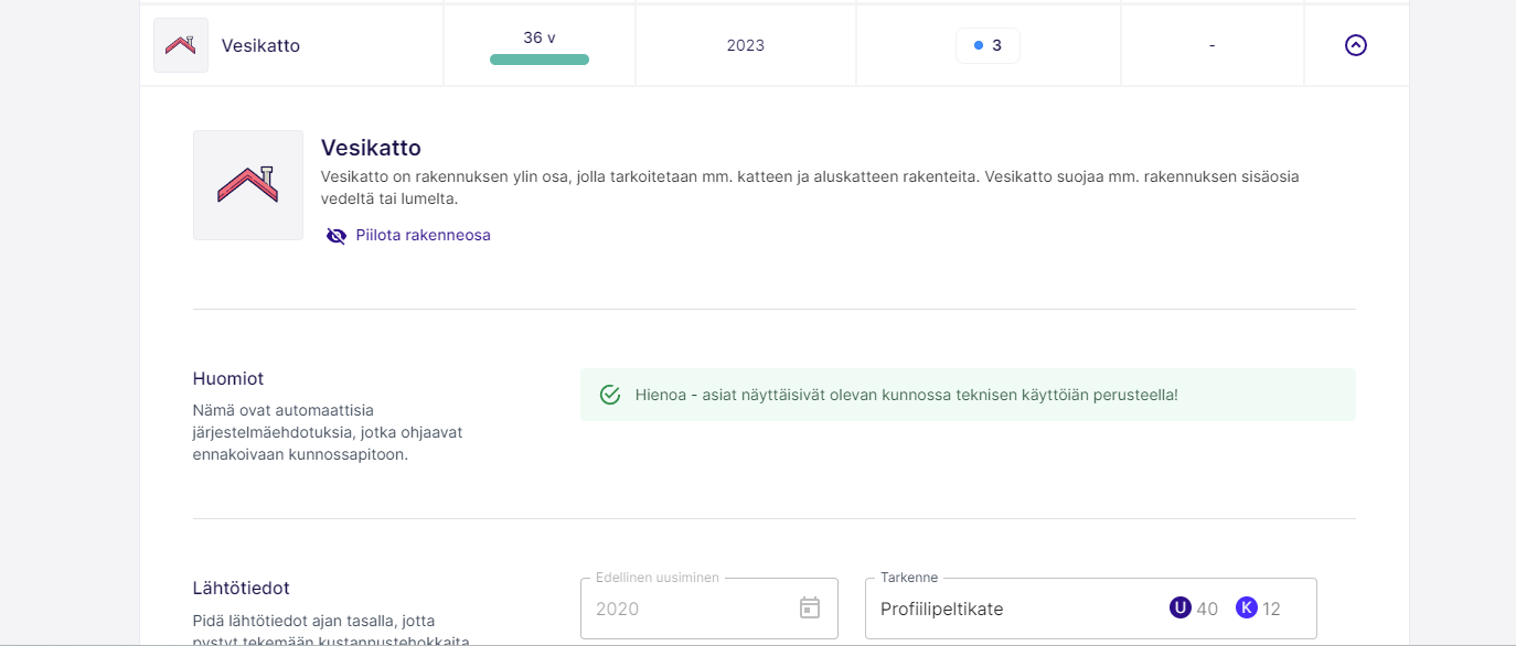 Rakenneosien kuntojakauma kertoo prosentuaalisesti, kuinka moni rakenneosista on uusimistarpeessa eri aikajaksoilla. Tähän lasketaan mukaan rakenneosat mitkä löytyvät Kaikki rakenneosat-suodattimen alta. Voit muokata esillä olevien rakenneosien listaa klikkaamalla rakenneosan auki ja painamalla piilota tai tuo näkyviin